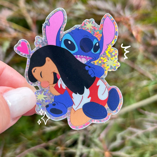 Lilo & Stitch Hug Glitter Sticker – Waterproof Vinyl Glitter Glossy Disney Ohana Decal for Water Bottles, Laptops & Tumblers