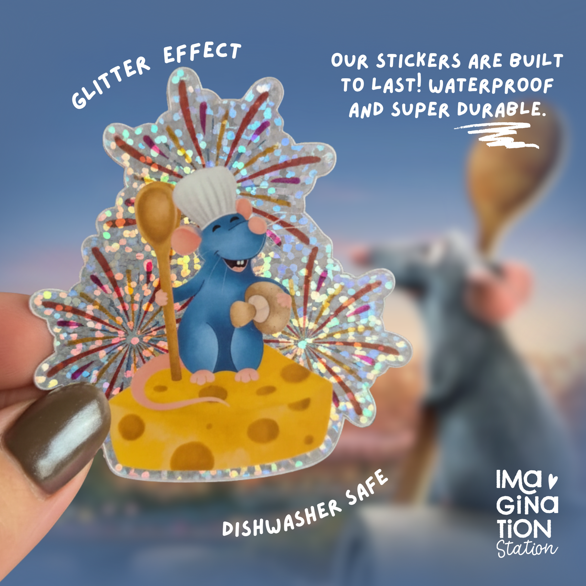 Whether you're a Disney Pixar fan or just love Remy's inspiring story, this glittery sticker is perfect for adding personality to your everyday items. The glossy finish combined with glitter effect makes this sticker truly stand out!