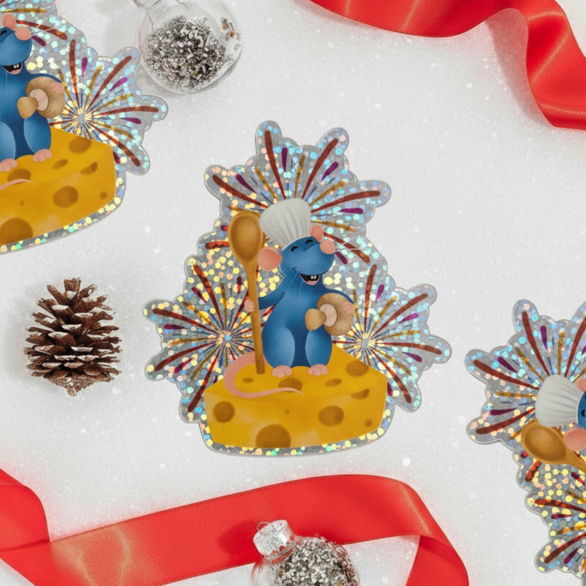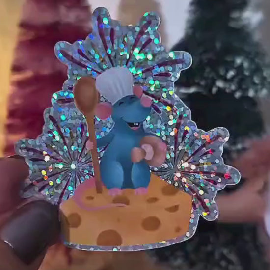 Bring the magic of Ratatouille to life with this charming waterproof sticker featuring everyone's favorite culinary rat! This sticker showcases a stunning glitter glossy effect that adds sparkle and shine to any surface.
