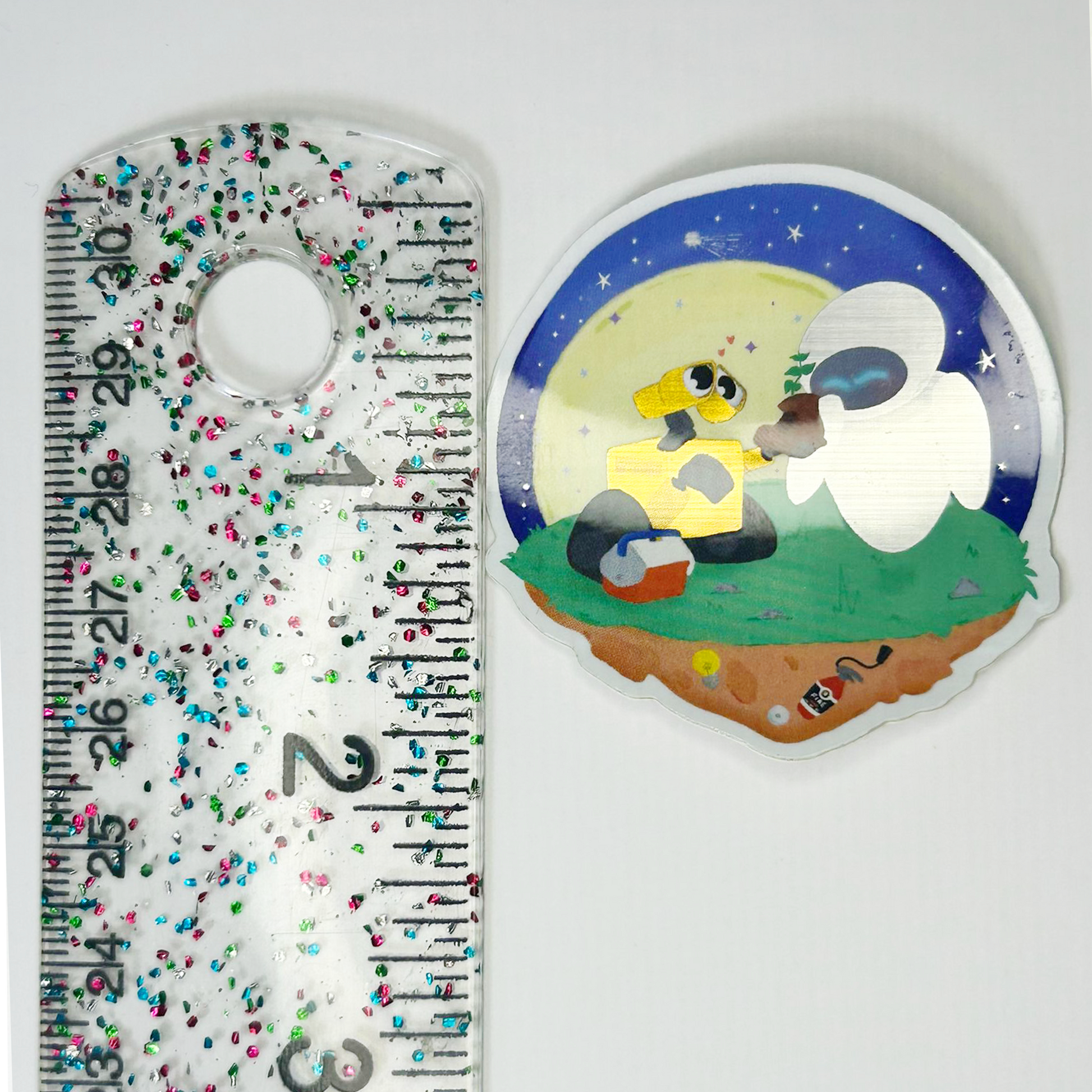 Bring Pixar magic to your everyday life with this WALL·E brush aluminum glossy vinyl sticker 1.9”x2”, featuring the beloved moment of WALL·E offering a flower. A tiny decal with a big heart — perfect for laptops, tumblers, journals, and more.